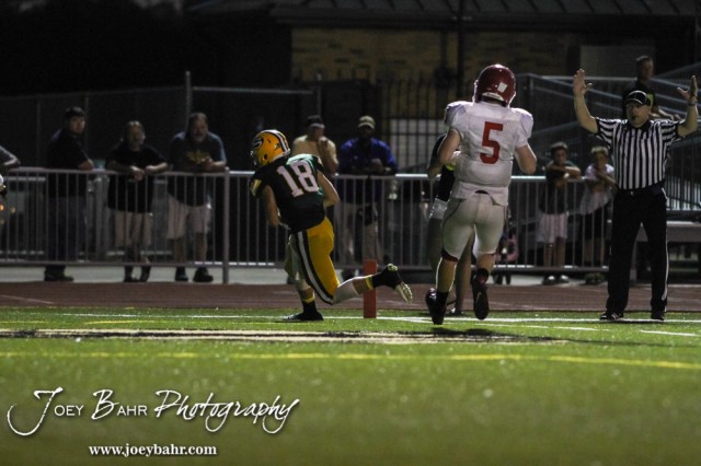 Salina South Cougar Jacob Marcotte (#18) scores a touchdown during the McPherson Bullpups versus Salina South Cougars High School Football gamme with Salina South winning 61 to 32 at Salina Stadium in Salina, Kansas on September 4, 2014. (Photo: Joey Bahr, www.joeybahr.com)