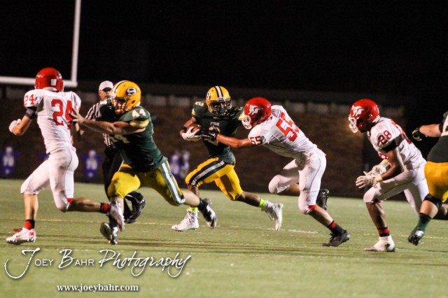 McPherson Bullpup Klayton Goering (#55) tries to tackle Salina South Cougar Eric Mccullough (#2) during the McPherson Bullpups versus Salina South Cougars High School Football gamme with Salina South winning 61 to 32 at Salina Stadium in Salina, Kansas on September 4, 2014. (Photo: Joey Bahr, www.joeybahr.com)