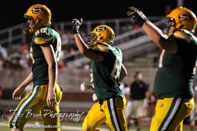 Salina South Cougar Trey Turner (#69) celebrates after a touchdown is scored during the McPherson Bullpups versus Salina South Cougars High School Football gamme with Salina South winning 61 to 32 at Salina Stadium in Salina, Kansas on September 4, 2014. (Photo: Joey Bahr, www.joeybahr.com)