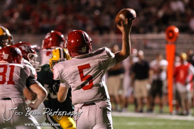McPherson Bullpup Kyler Kinnamon (#5) throws a pass during the McPherson Bullpups versus Salina South Cougars High School Football gamme with Salina South winning 61 to 32 at Salina Stadium in Salina, Kansas on September 4, 2014. (Photo: Joey Bahr, www.joeybahr.com)