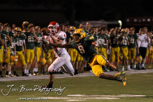 McPherson Bullpup Luke Williams (#4) pulls in a pass as Salina South Cougar Steven Slayton (#9) tries to cover during the McPherson Bullpups versus Salina South Cougars High School Football gamme with Salina South winning 61 to 32 at Salina Stadium in Salina, Kansas on September 4, 2014. (Photo: Joey Bahr, www.joeybahr.com)