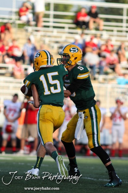 Salina South Cougar Dalton Wassenberg (#5) hands the ball off to Dylan Becker (#15) during the McPherson Bullpups versus Salina South Cougars High School Football gamme with Salina South winning 61 to 32 at Salina Stadium in Salina, Kansas on September 4, 2014. (Photo: Joey Bahr, www.joeybahr.com)