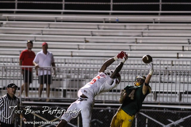 Salina South Cougar D.J. Weir (#4) tries to grab a pass that went through the hands of McPherson Bullpup Spenser Wine (#6) during the McPherson Bullpups versus Salina South Cougars High School Football gamme with Salina South winning 61 to 32 at Salina Stadium in Salina, Kansas on September 4, 2014. (Photo: Joey Bahr, www.joeybahr.com)