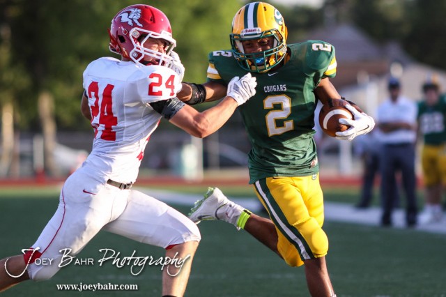 Salina South Cougar Eric Mccullough (#2) stiff arms McPherson Bullpup Casey Cheek (#24) during the McPherson Bullpups versus Salina South Cougars High School Football gamme with Salina South winning 61 to 32 at Salina Stadium in Salina, Kansas on September 4, 2014. (Photo: Joey Bahr, www.joeybahr.com)