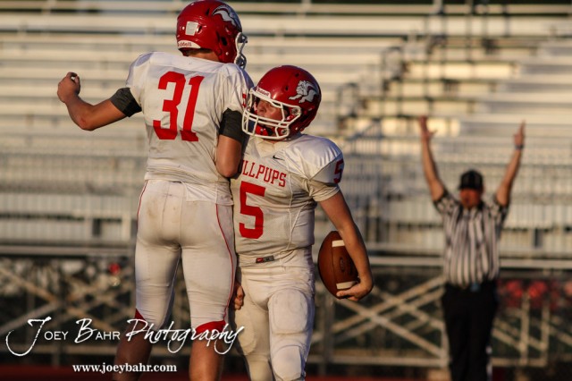 McPherson Bullpup Kyler Kinnamon (#5) celebrates scoring a touchdown during the McPherson Bullpups versus Salina South Cougars High School Football gamme with Salina South winning 61 to 32 at Salina Stadium in Salina, Kansas on September 4, 2014. (Photo: Joey Bahr, www.joeybahr.com)