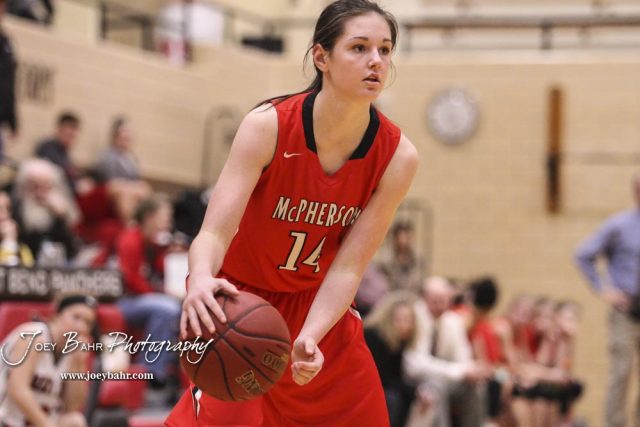McPherson Lady Bullpup #14 Lakyn Schieferecke looks for a teammate to pass the ball to. The McPherson Lady Bullpups defeated the Great Bend Lady Panthers with a score of 69 to 38 at the Great Bend High School Fieldhouse in Great Bend, Kansas on February 7, 2017. (Photo: Joey Bahr, www.joeybahr.com)undefined