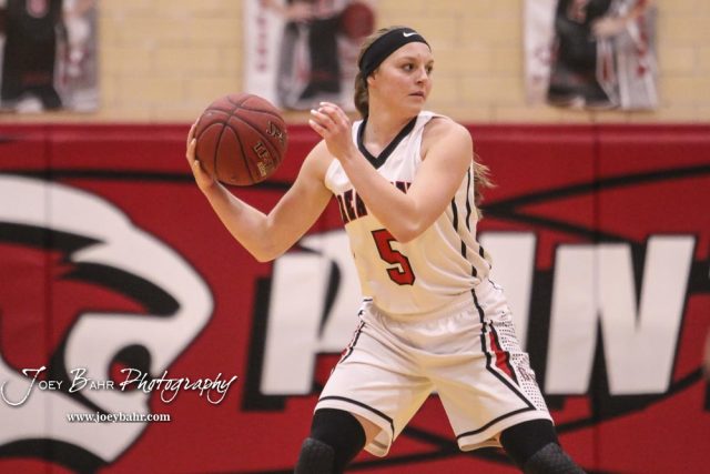 Great Bend Lady Panther #5 Camryn Dunekack looks for a teammate to pass the ball to. The McPherson Lady Bullpups defeated the Great Bend Lady Panthers with a score of 69 to 38 at the Great Bend High School Fieldhouse in Great Bend, Kansas on February 7, 2017. (Photo: Joey Bahr, www.joeybahr.com)undefined