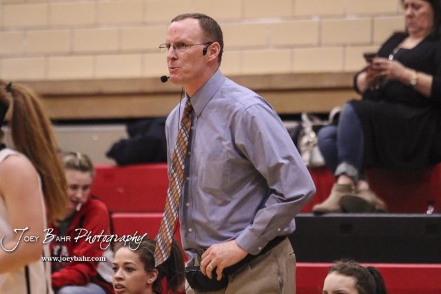 McPherson Lady Bullpup Head Coach Chris Strathman reacts to a play on the floor. The McPherson Lady Bullpups defeated the Great Bend Lady Panthers with a score of 69 to 38 at the Great Bend High School Fieldhouse in Great Bend, Kansas on February 7, 2017. (Photo: Joey Bahr, www.joeybahr.com)undefined