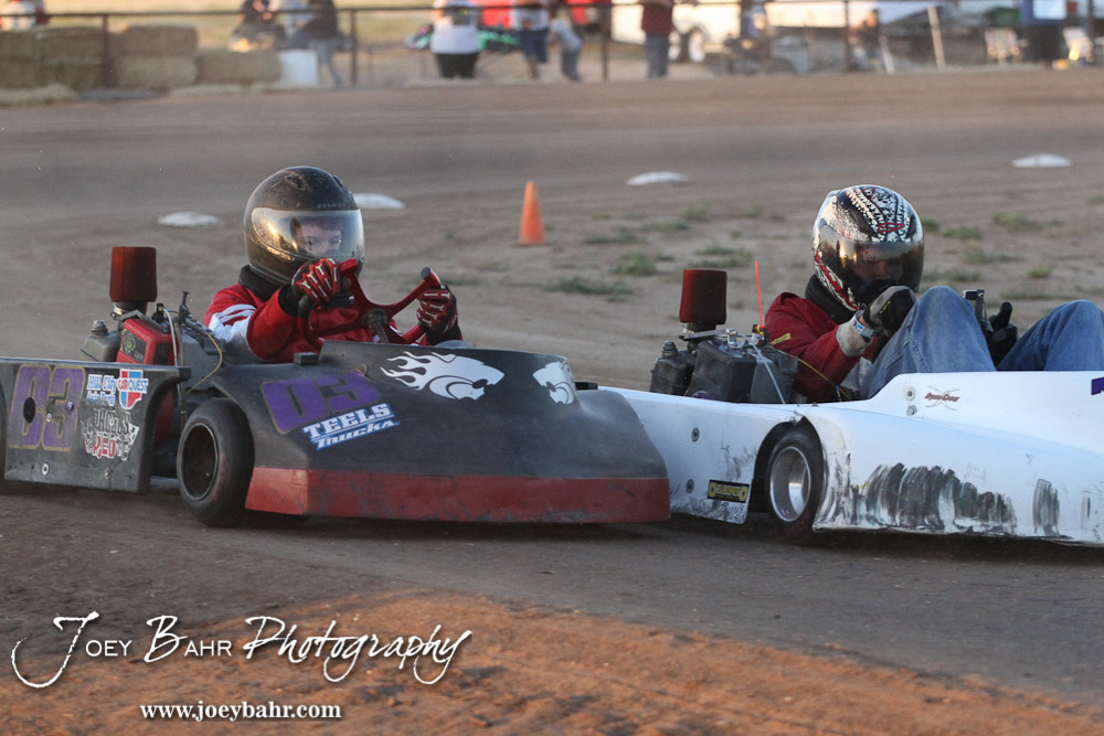 Dakota Bliss(#03) and Wesley Reicheck(#2) race in the Feature Race of the Junior 2 Heavy Class at the Ness County Speedway Kart Races sponsored by Walker Tank Service at Ness County Speedway in Ness City, Kansas on August 18, 2012. (Photo: Joey Bahr, www.joeybahr.com)