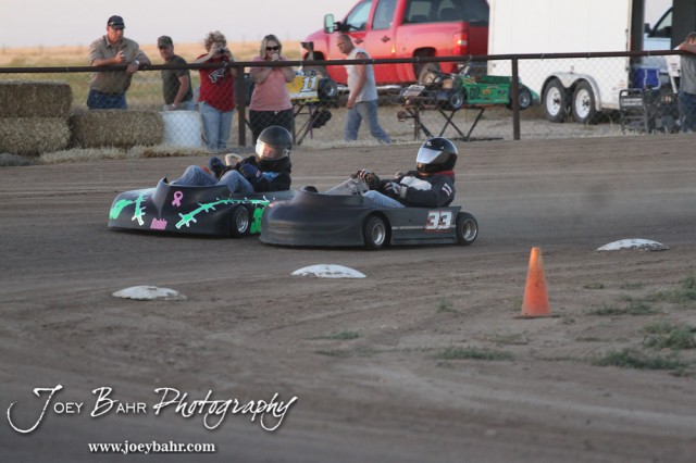 Justin Whiting(#33) looks to pass Tristan Slagle(#38) on the inside in the Feature Race of the Clones Class at the Ness County Speedway Kart Races sponsored by Walker Tank Service at Ness County Speedway in Ness City, Kansas on August 18, 2012. (Photo: Joey Bahr, www.joeybahr.com)