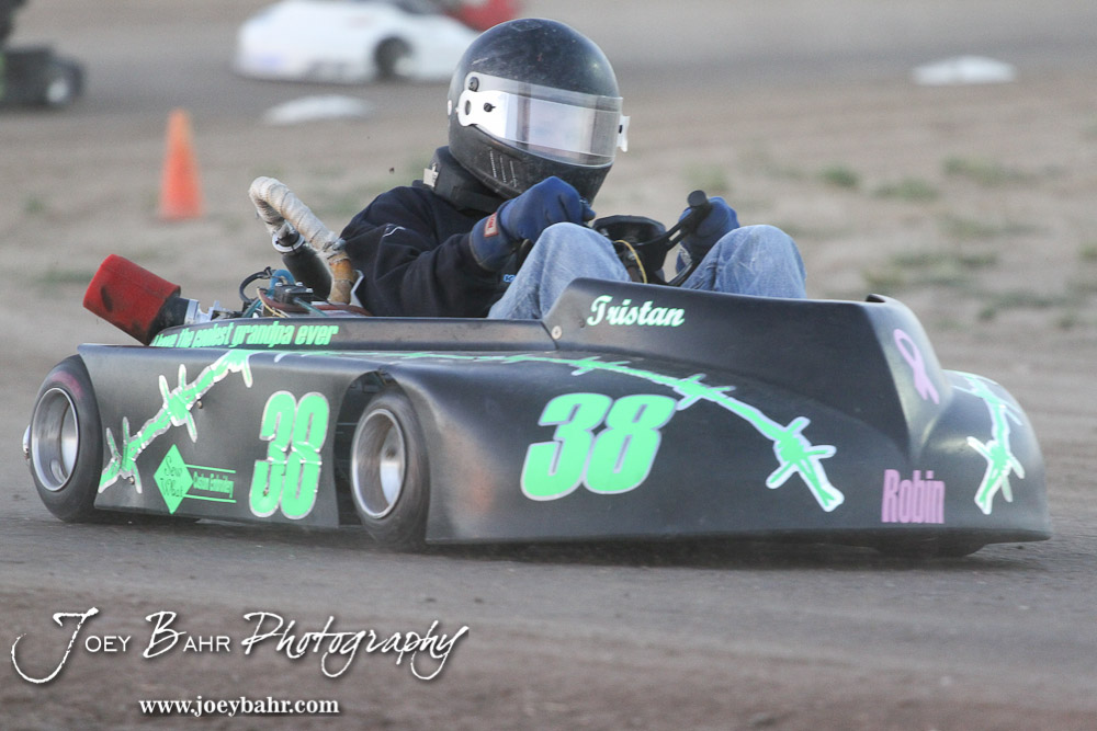 Tristan Slagle(#38) drives in the Clones Class Feature Race at the Ness County Speedway Kart Races sponsored by Walker Tank Service at Ness County Speedway in Ness City, Kansas on August 18, 2012. (Photo: Joey Bahr, www.joeybahr.com)