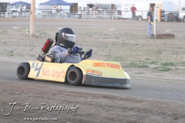 Bob Buchholtz(#B4) drives in the Feature Race of the Adult/Animal Class at the Ness County Speedway Kart Races sponsored by Walker Tank Service at Ness County Speedway in Ness City, Kansas on August 18, 2012. (Photo: Joey Bahr, www.joeybahr.com)