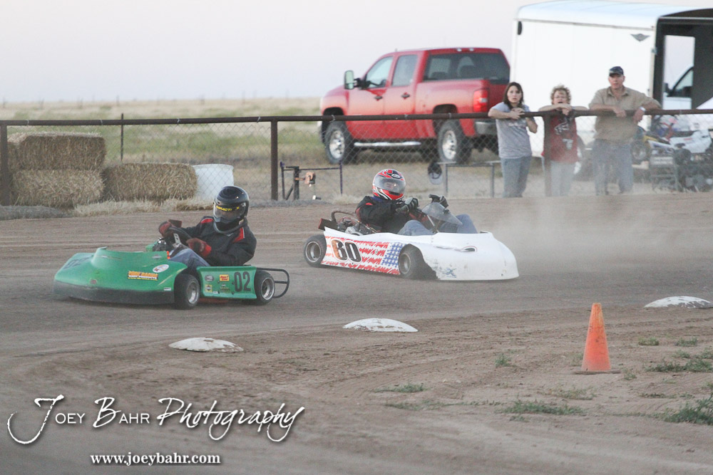 Blane Buchholtz(#02) drives on as Gary Richards(#60) spins out in the Feature Race of the Adult/Animal Class at the Ness County Speedway Kart Races sponsored by Walker Tank Service at Ness County Speedway in Ness City, Kansas on August 18, 2012. (Photo: Joey Bahr, www.joeybahr.com)