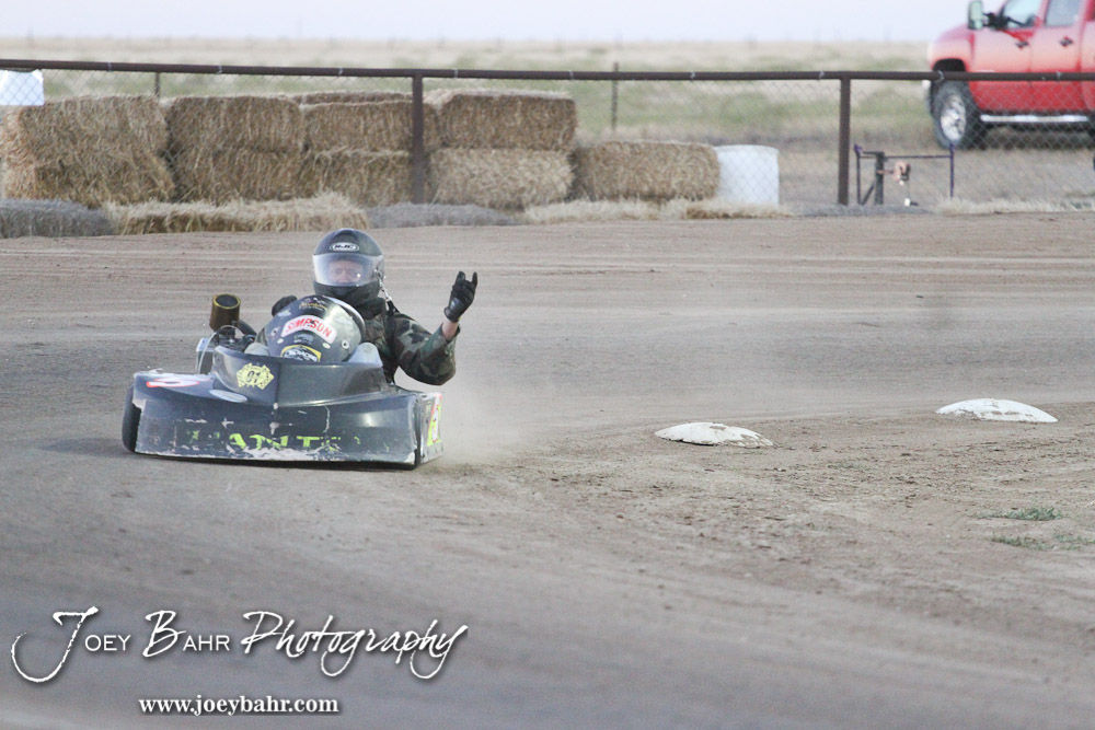 Clarence Bliss(#5) celebrates his win in the Feature Race of the Adult/Animal Class at the Ness County Speedway Kart Races sponsored by Walker Tank Service at Ness County Speedway in Ness City, Kansas on August 18, 2012. (Photo: Joey Bahr, www.joeybahr.com)