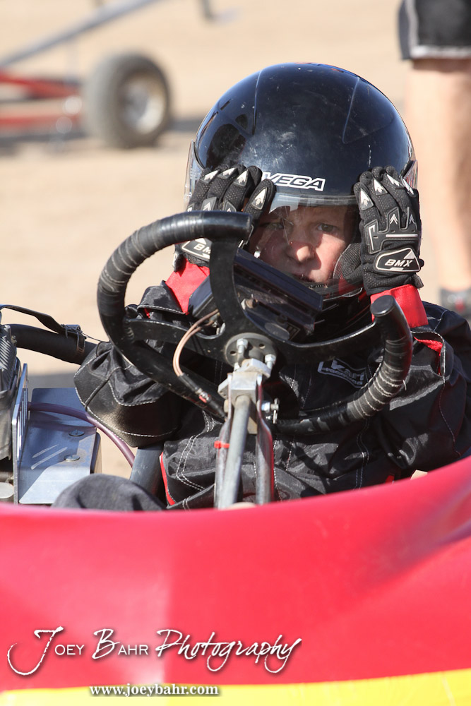 Gratton Dalton(#73) pulls down his visor prior to Heat 1 of the Rookie Class at the Ness County Speedway Kart Races sponsored by Walker Tank Service at Ness County Speedway in Ness City, Kansas on August 18, 2012. (Photo: Joey Bahr, www.joeybahr.com)