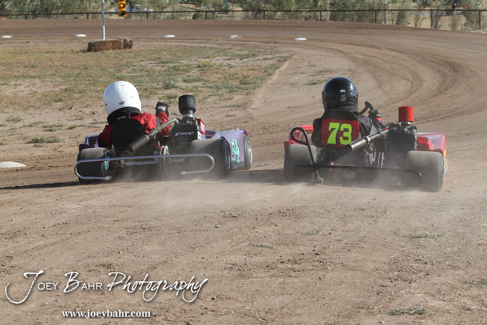 Nicholas Sherfick(#54) and Gratton Dalton(#73) take to the track at the Ness County Speedway Kart Races sponsored by Walker Tank Service at Ness County Speedway in Ness City, Kansas on August 18, 2012. (Photo: Joey Bahr, www.joeybahr.com)