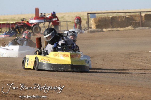 Bob Buchholtz(#B4) drives in Heat 1 of the Adult/Animal Class at the Ness County Speedway Kart Races sponsored by Walker Tank Service at Ness County Speedway in Ness City, Kansas on August 18, 2012. (Photo: Joey Bahr, www.joeybahr.com)