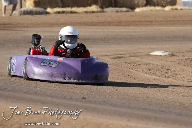 Nicholas Sherfick(#54) drives in Heat 1 of the Rookie Class at the Ness County Speedway Kart Races sponsored by Walker Tank Service at Ness County Speedway in Ness City, Kansas on August 18, 2012. (Photo: Joey Bahr, www.joeybahr.com)