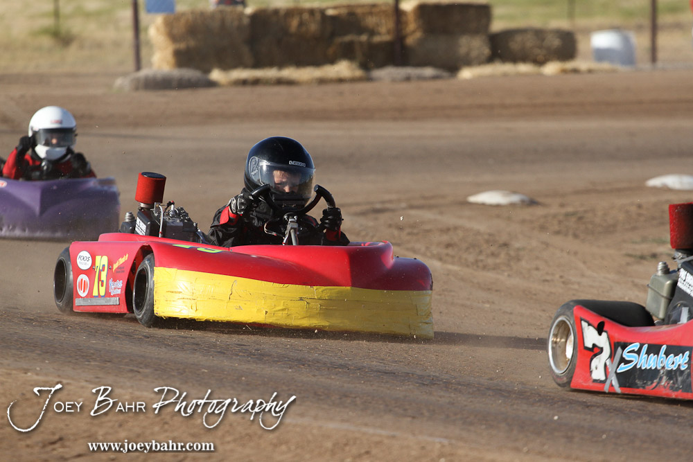 Gratton Dalton(#73) drive in Heat 1 of the Junior 1 Light Class/Rookie Class at the Ness County Speedway Kart Races sponsored by Walker Tank Service at Ness County Speedway in Ness City, Kansas on August 18, 2012. (Photo: Joey Bahr, www.joeybahr.com)