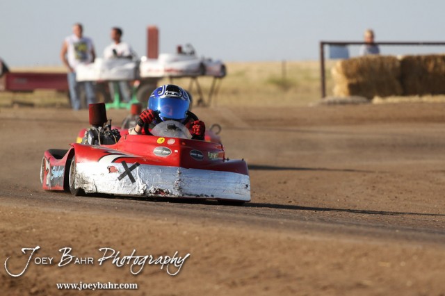 Cooper Shubert(#7X) drives in Heat 1 of the Junior 1 Light Class at the Ness County Speedway Kart Races sponsored by Walker Tank Service at Ness County Speedway in Ness City, Kansas on August 18, 2012. (Photo: Joey Bahr, www.joeybahr.com)