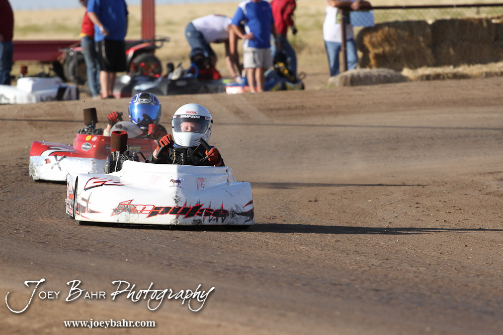 Tyler Walker(#20) and Cooper Shubert(#7X) race in Heat 1 of the Junior 2 Light Class at the Ness County Speedway Kart Races sponsored by Walker Tank Service at Ness County Speedway in Ness City, Kansas on August 18, 2012. (Photo: Joey Bahr, www.joeybahr.com)