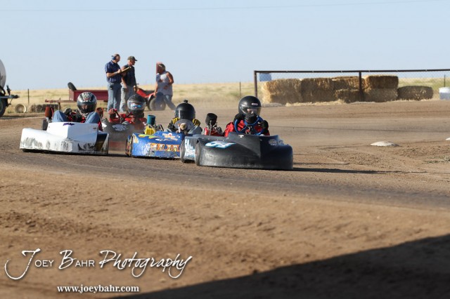 Racers start Heat 1 of the Junior 2 Heavy Class at the Ness County Speedway Kart Races sponsored by Walker Tank Service at Ness County Speedway in Ness City, Kansas on August 18, 2012. (Photo: Joey Bahr, www.joeybahr.com)