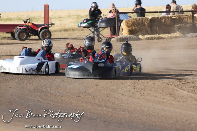 Racers restart Heat 1 of the Junior 2 Heavy Class at the Ness County Speedway Kart Races sponsored by Walker Tank Service at Ness County Speedway in Ness City, Kansas on August 18, 2012. (Photo: Joey Bahr, www.joeybahr.com)