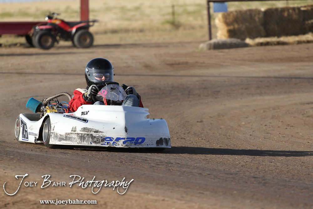 Wendy Parcell(#26) drives in Heat 1 of the Clones Class at the Ness County Speedway Kart Races sponsored by Walker Tank Service at Ness County Speedway in Ness City, Kansas on August 18, 2012. (Photo: Joey Bahr, www.joeybahr.com)