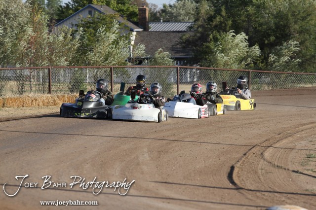 Racers in the Adult/Animal Class start Heat 2 at the Ness County Speedway Kart Races sponsored by Walker Tank Service at Ness County Speedway in Ness City, Kansas on August 18, 2012. (Photo: Joey Bahr, www.joeybahr.com)