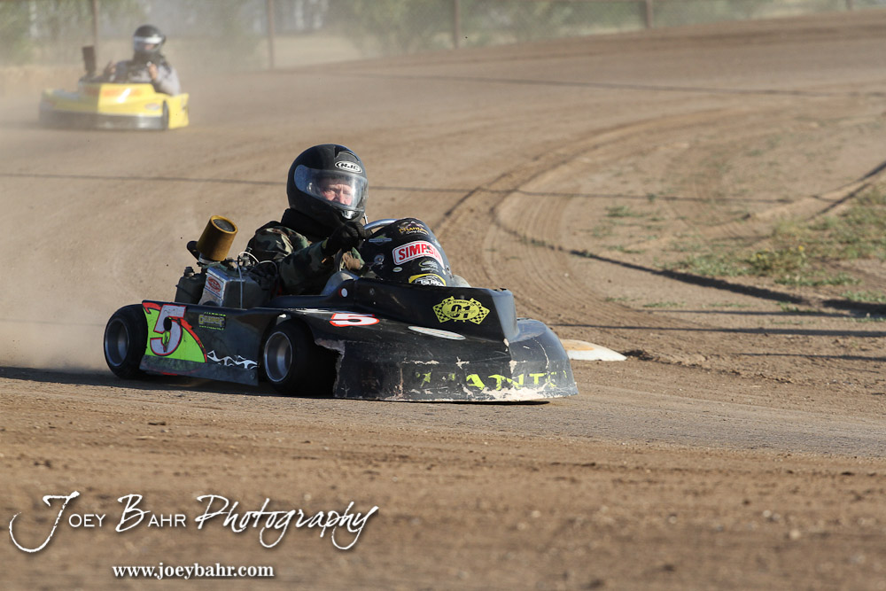 Clarence Bliss(#5) drives in Heat 2 of the Adult/Animal Class at the Ness County Speedway Kart Races sponsored by Walker Tank Service at Ness County Speedway in Ness City, Kansas on August 18, 2012. (Photo: Joey Bahr, www.joeybahr.com)
