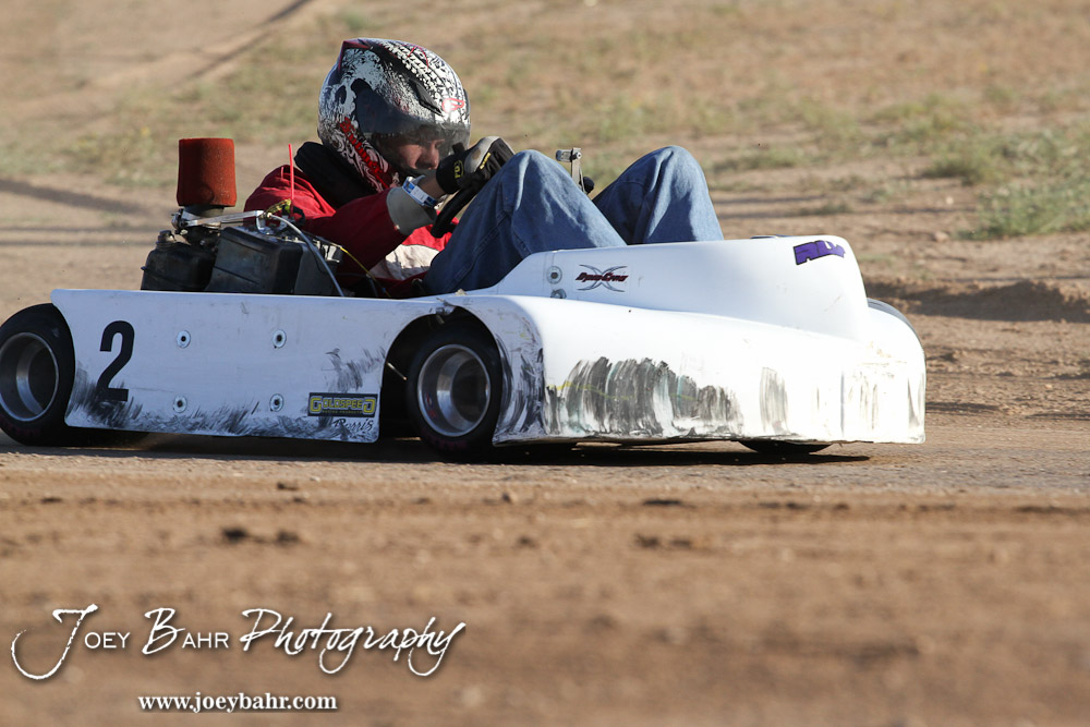 Wesley Reicheck(#2) drives in Heat 2 of the Junior 2 Light Class at the Ness County Speedway Kart Races sponsored by Walker Tank Service at Ness County Speedway in Ness City, Kansas on August 18, 2012. (Photo: Joey Bahr, www.joeybahr.com)