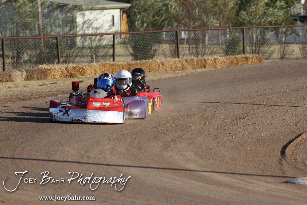 Cooper Shubert(#7X) leads Nicholas Sherfick(#54) and Gratton Dalton(#73) in Heat 2 of the Junior 1 Light Class/Rookie Class at the Ness County Speedway Kart Races sponsored by Walker Tank Service at Ness County Speedway in Ness City, Kansas on August 18, 2012. (Photo: Joey Bahr, www.joeybahr.com)