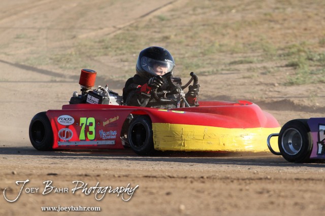 Gratton Dalton(#73) races in Heat 2 of the Rookie Class at the Ness County Speedway Kart Races sponsored by Walker Tank Service at Ness County Speedway in Ness City, Kansas on August 18, 2012. (Photo: Joey Bahr, www.joeybahr.com)