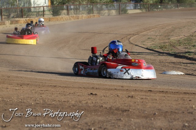 Cooper Shubert(#7X) leads the field in Heat 2 of the Junior 1 Light Class/Rookie Class at the Ness County Speedway Kart Races sponsored by Walker Tank Service at Ness County Speedway in Ness City, Kansas on August 18, 2012. (Photo: Joey Bahr, www.joeybahr.com)