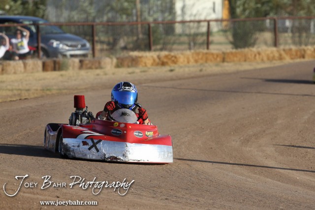 Cooper Shubert(#7X) drives in Heat 2 of the Junior 1 Light Class at the Ness County Speedway Kart Races sponsored by Walker Tank Service at Ness County Speedway in Ness City, Kansas on August 18, 2012. (Photo: Joey Bahr, www.joeybahr.com)