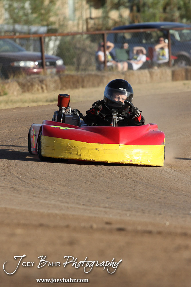 Gratton Dalton(#73) drives in Heat 2 of the Rookie Class at the Ness County Speedway Kart Races sponsored by Walker Tank Service at Ness County Speedway in Ness City, Kansas on August 18, 2012. (Photo: Joey Bahr, www.joeybahr.com)