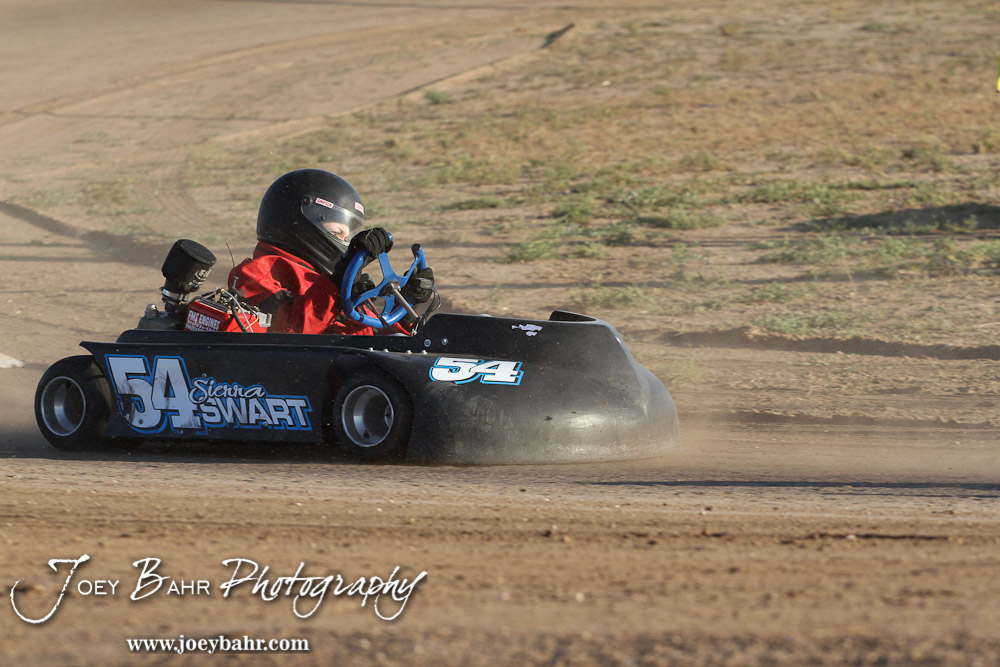 Sierra Swart(#54) drives in Heat 2 of the Junior 2 Heavy Class at the Ness County Speedway Kart Races sponsored by Walker Tank Service at Ness County Speedway in Ness City, Kansas on August 18, 2012. (Photo: Joey Bahr, www.joeybahr.com)
