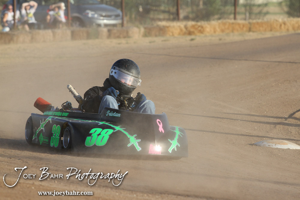 Tristan Slagle(#38) drives in Heat 2 of the Clones Class at the Ness County Speedway Kart Races sponsored by Walker Tank Service at Ness County Speedway in Ness City, Kansas on August 18, 2012. (Photo: Joey Bahr, www.joeybahr.com)