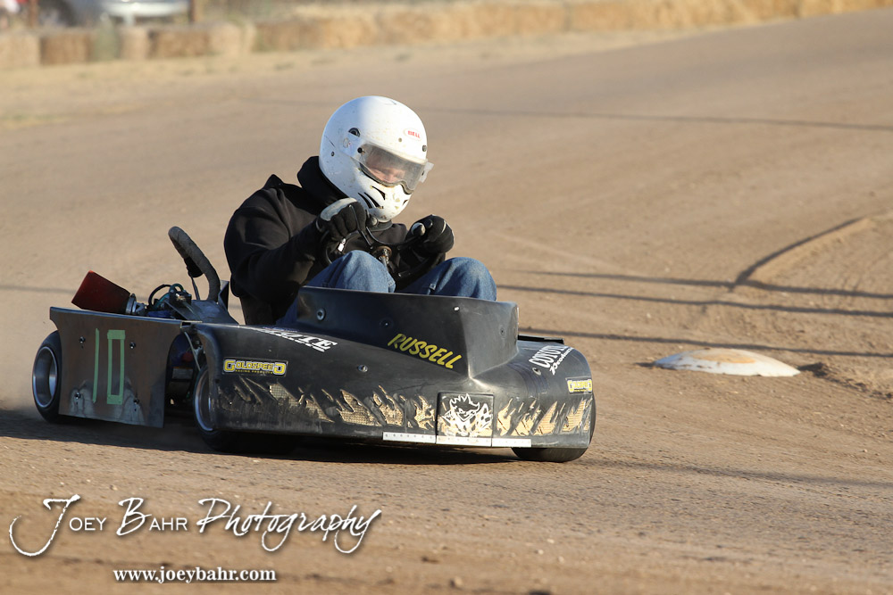 Dakota Slagle(#10) drives in Heat 2 of the Clones Class at the Ness County Speedway Kart Races sponsored by Walker Tank Service at Ness County Speedway in Ness City, Kansas on August 18, 2012. (Photo: Joey Bahr, www.joeybahr.com)