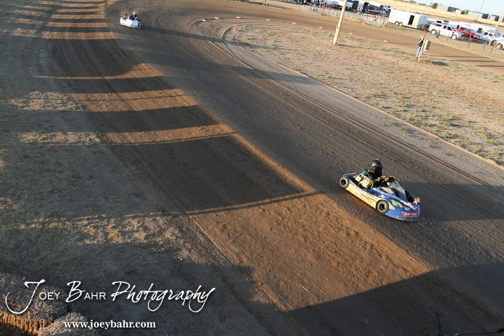 Jeremy Huish(#88) leads Wesley Reicheck(#2) early in the Junior 2 Light Class Feature Race at the Ness County Speedway Kart Races sponsored by Walker Tank Service at Ness County Speedway in Ness City, Kansas on August 18, 2012. (Photo: Joey Bahr, www.joeybahr.com)