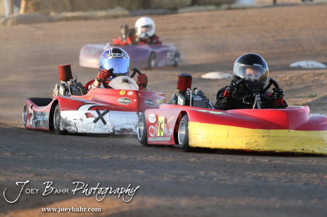Gratton Dalton(#73) and Cooper Shubert(#7X) drive in the Feature Race of the Rookie Class/Junior 1 Light Class at the Ness County Speedway Kart Races sponsored by Walker Tank Service at Ness County Speedway in Ness City, Kansas on August 18, 2012. (Photo: Joey Bahr, www.joeybahr.com)