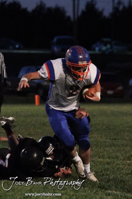 Otis-Bison Cougar Dylan Wissman (#2) runs past two Sylvan-Lucas Unified Mustang tacklers during the Otis-Bison visiting Sylvan-Lucas Unified Eight Man Division II District 7 matchup with Otis-Bison winning 76-26 in Sylvan Grove, Kansas on October 25, 2012. (Photo: Joey Bahr, www.joeybahr.com)