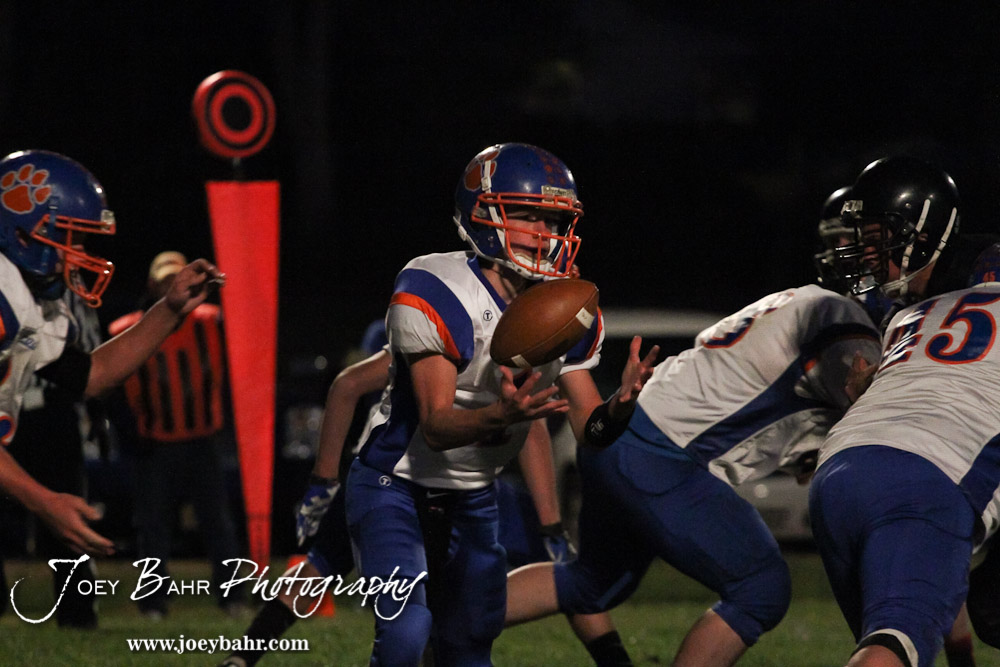 The ball pops up on Otis-Bison Cougar Kole Urban (#1) during the Otis-Bison visiting Sylvan-Lucas Unified Eight Man Division II District 7 matchup with Otis-Bison winning 76-26 in Sylvan Grove, Kansas on October 25, 2012. (Photo: Joey Bahr, www.joeybahr.com)