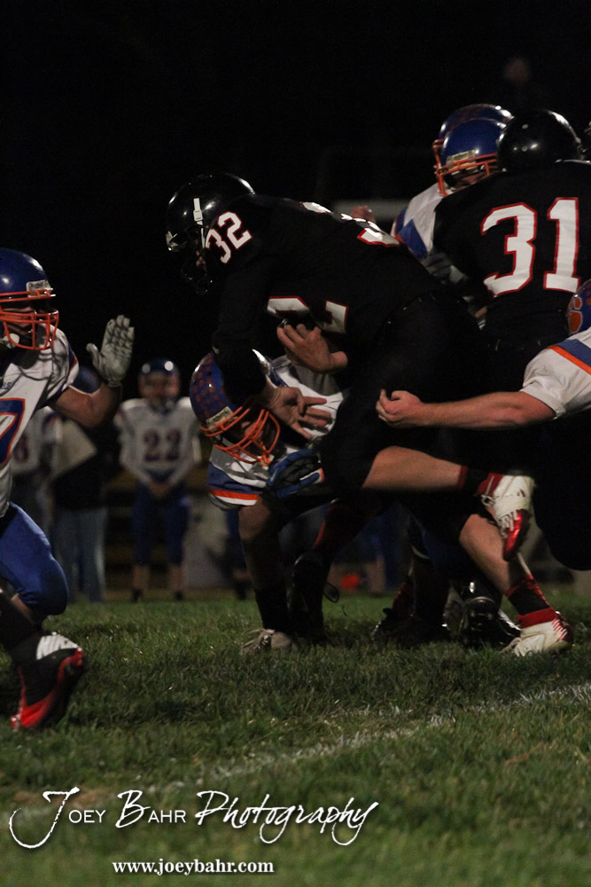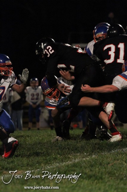 Sylvan-Lucas Unified Mustang Brogan Naylor (#32) runs through the Otis-Bison Cougar defense during the Otis-Bison visiting Sylvan-Lucas Unified Eight Man Division II District 7 matchup with Otis-Bison winning 76-26 in Sylvan Grove, Kansas on October 25, 2012. (Photo: Joey Bahr, www.joeybahr.com)