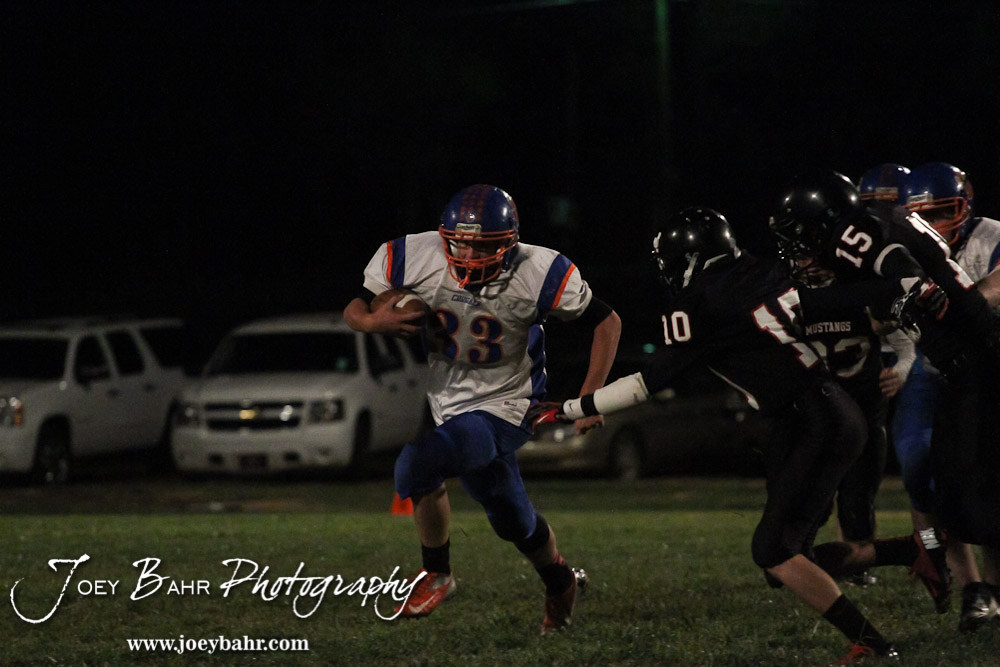 Otis-Bison Cougar Jordan Hoffman (#33) runs around Sylvan-Lucas Unified Mustang Ty Heenan (#10) during the Otis-Bison visiting Sylvan-Lucas Unified Eight Man Division II District 7 matchup with Otis-Bison winning 76-26 in Sylvan Grove, Kansas on October 25, 2012. (Photo: Joey Bahr, www.joeybahr.com)