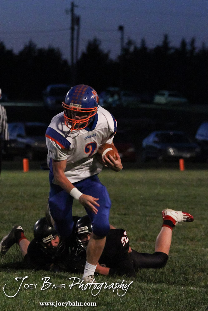 Otis-Bison Cougar Dylan Wissman (#2) runs past two Sylvan-Lucas Unified Mustang tacklers during the Otis-Bison visiting Sylvan-Lucas Unified Eight Man Division II District 7 matchup with Otis-Bison winning 76-26 in Sylvan Grove, Kansas on October 25, 2012. (Photo: Joey Bahr, www.joeybahr.com)