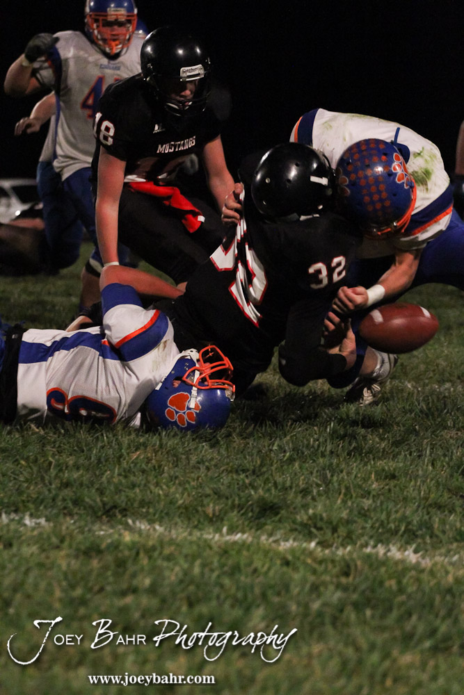 Otis-Bison Cougars Dylan Wissman (#2) and Tyler Maier (#90) hit Sylvan-Lucas Unified Mustang Brogan Naylor (#32) during the Otis-Bison visiting Sylvan-Lucas Unified Eight Man Division II District 7 matchup with Otis-Bison winning 76-26 in Sylvan Grove, Kansas on October 25, 2012. (Photo: Joey Bahr, www.joeybahr.com)