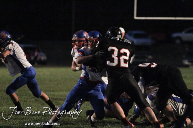 Otis-Bison Cougar Kade Hagans (#23) blocks Sylvan-Lucas Unified Mustang Brogan Naylor (#32) during the Otis-Bison visiting Sylvan-Lucas Unified Eight Man Division II District 7 matchup with Otis-Bison winning 76-26 in Sylvan Grove, Kansas on October 25, 2012. (Photo: Joey Bahr, www.joeybahr.com)