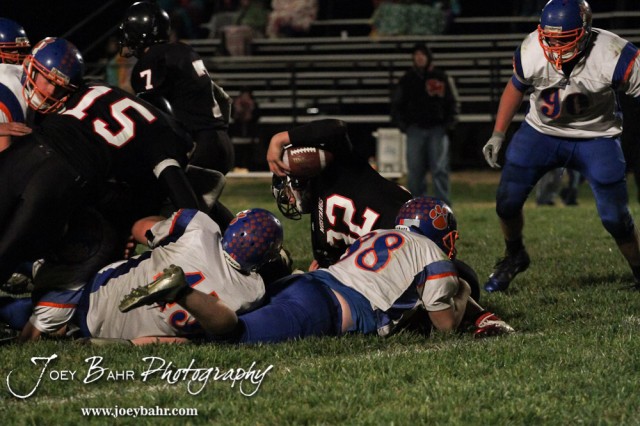 Otis-Bison Cougar Matthew Demel (#88) sacks Sylvan-Lucas Unified Mustang Brogan Naylor (#32) during the Otis-Bison visiting Sylvan-Lucas Unified Eight Man Division II District 7 matchup with Otis-Bison winning 76-26 in Sylvan Grove, Kansas on October 25, 2012. (Photo: Joey Bahr, www.joeybahr.com)