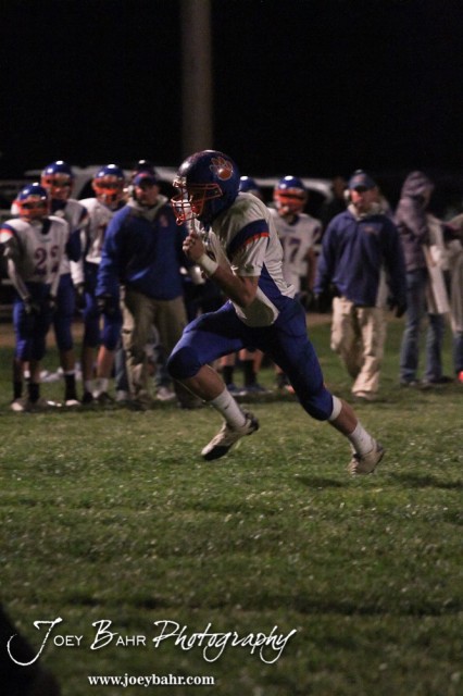 Otis-Bison Cougar Dylan Wissman (#2) runs with the ball during the Otis-Bison visiting Sylvan-Lucas Unified Eight Man Division II District 7 matchup with Otis-Bison winning 76-26 in Sylvan Grove, Kansas on October 25, 2012. (Photo: Joey Bahr, www.joeybahr.com)